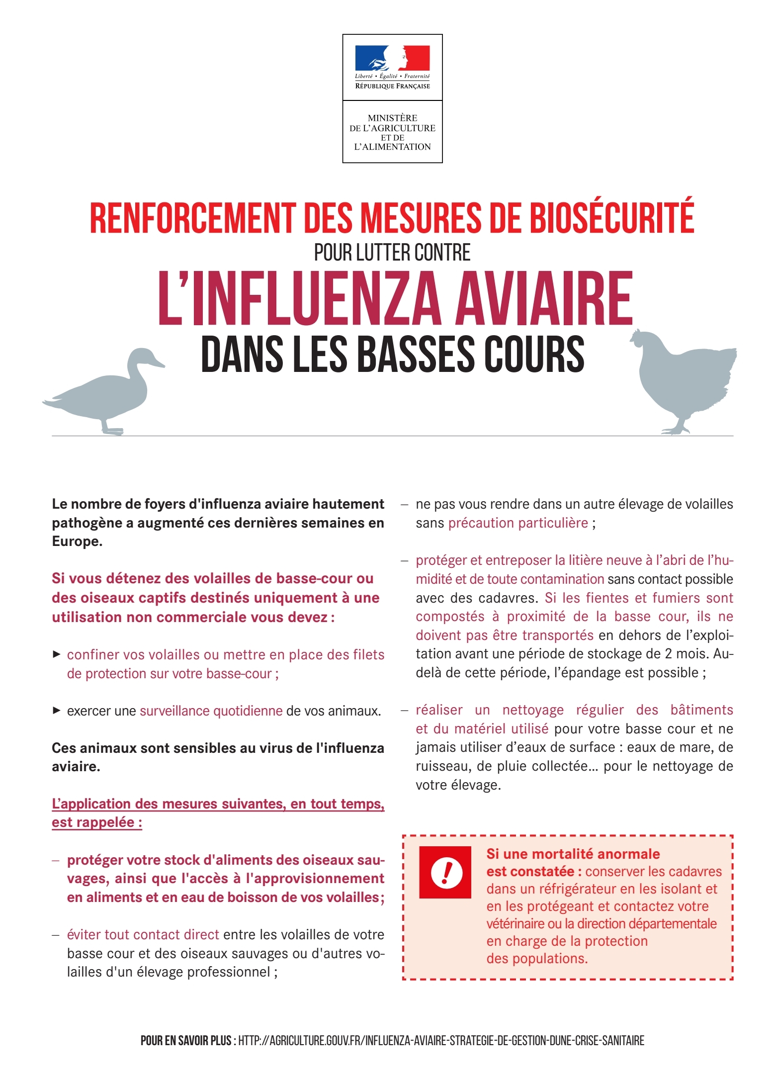 Le département de la Gironde a été classé en risque élevé vis à vis de l’IAHP ( inflenza aviaire hautement pathogène) à compter du 4 novembre 2020.