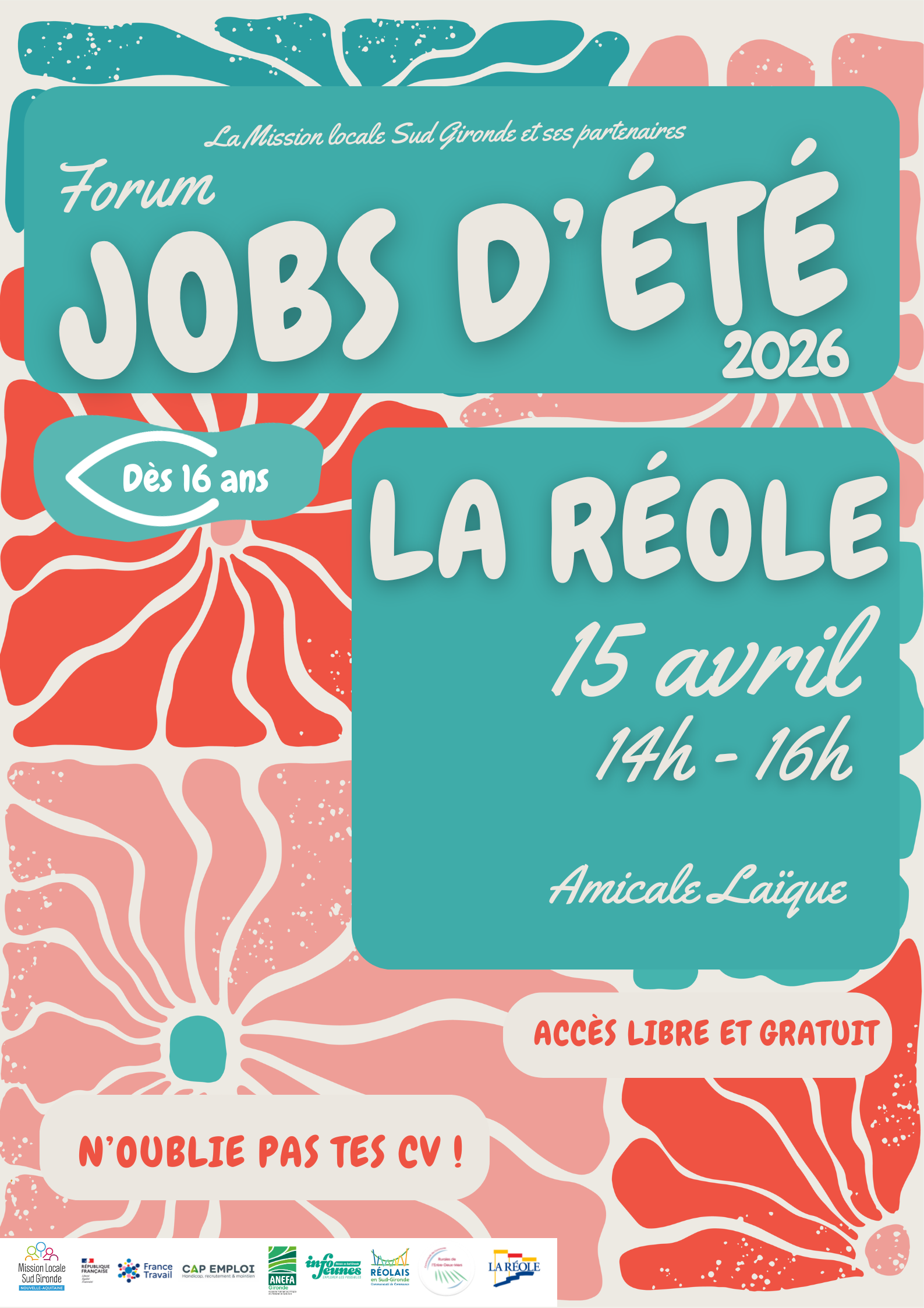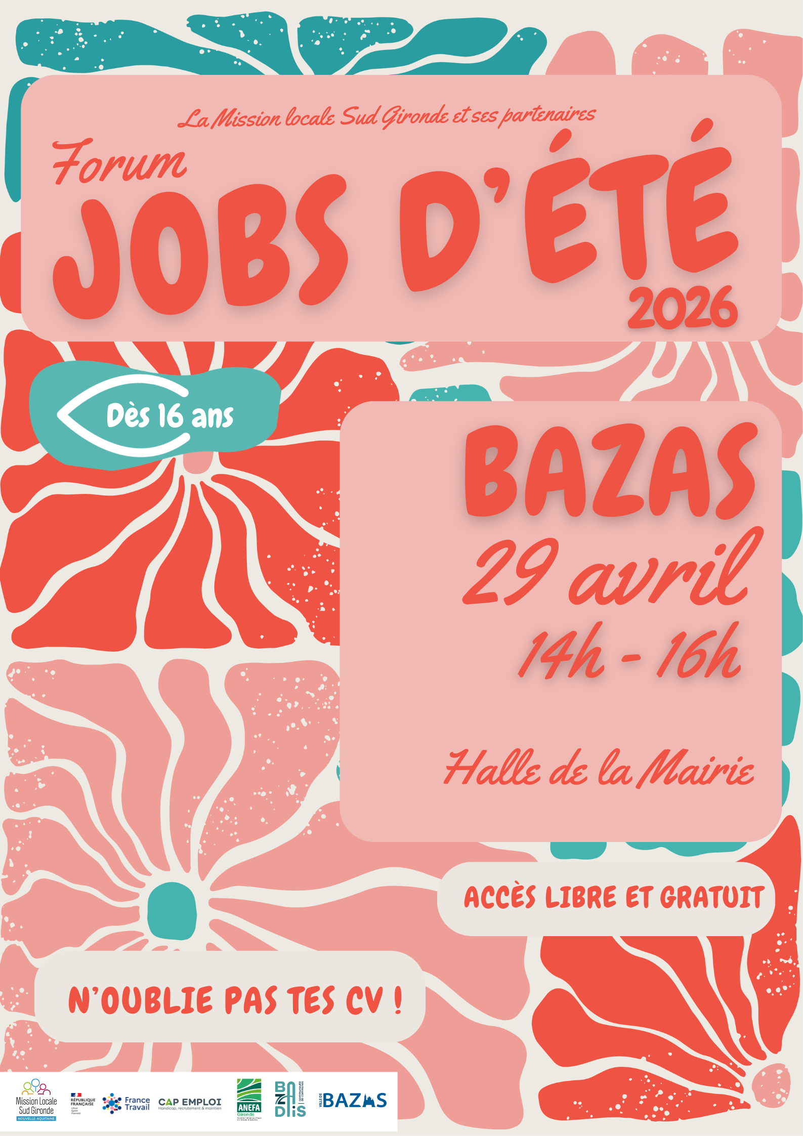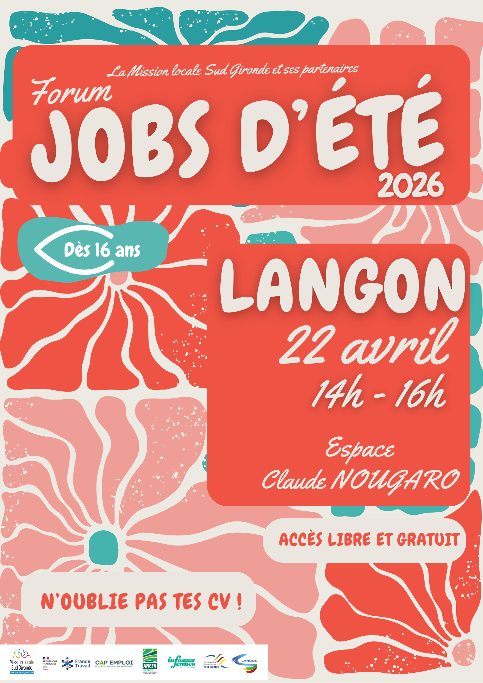 La Mission Locale Sud Gironde, en collaboration avec les partenaires du Réseau pour l’Emploi (France Travail, Cap Emploi), a le plaisir de vous annoncer le lancement de l’édition 2026 des Forums Jobs d’Été.