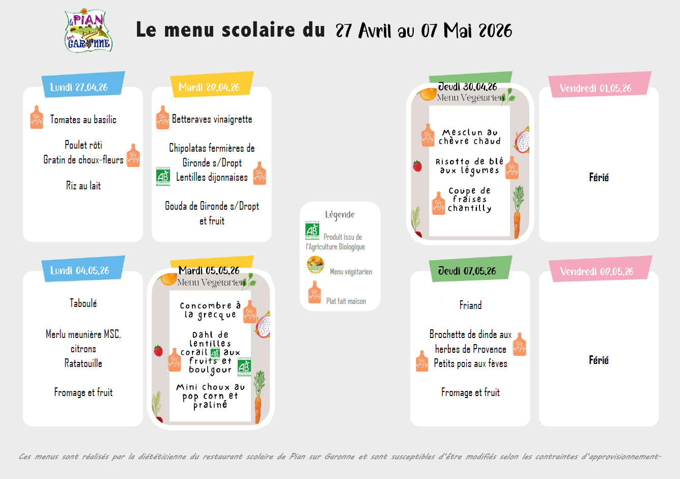 Voici les repas de vos bambins pour les deux semaines à venir!